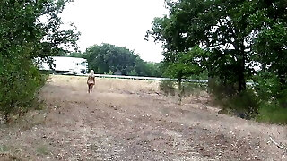 A chained slave is disciplined to dance naked on the highway