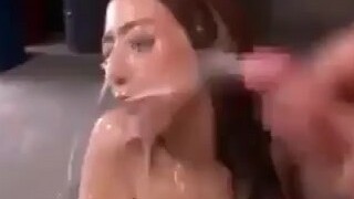 Cute bukkake whore takes a warm Cum bath